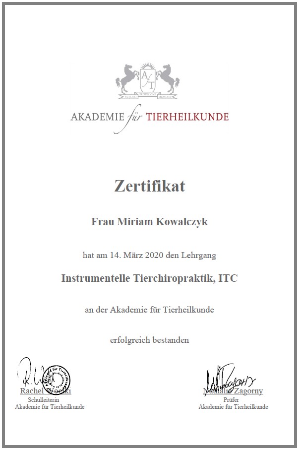 Die instrumentelle Tierchiropraktik (ITC) ist eine aus den USA stammende, weiterentwickelte Methode zur Behandlung von Funktionsstörungen am Bewegungsapparat.